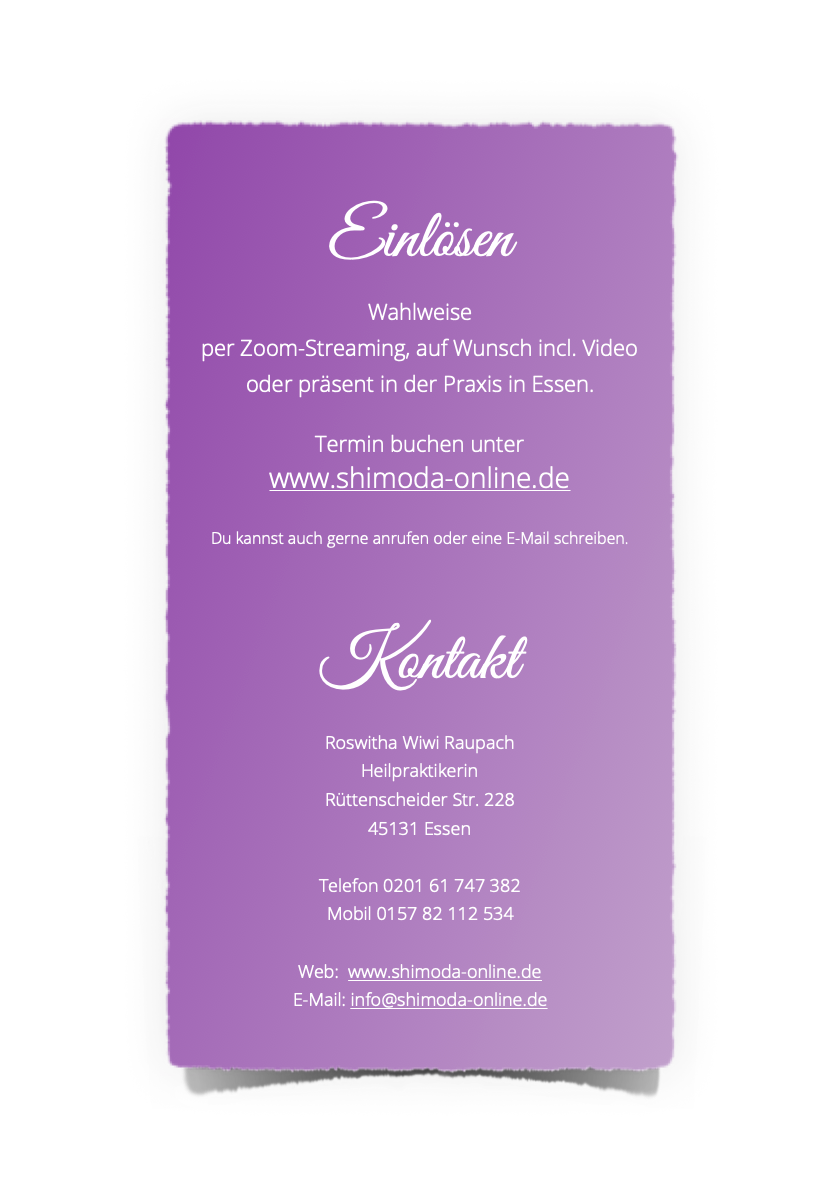 Die Session kann wahlweise per Zoom-Streaming, auf Wunsch incl. Video oder präsent in der Praxis in Essen gebucht werden.